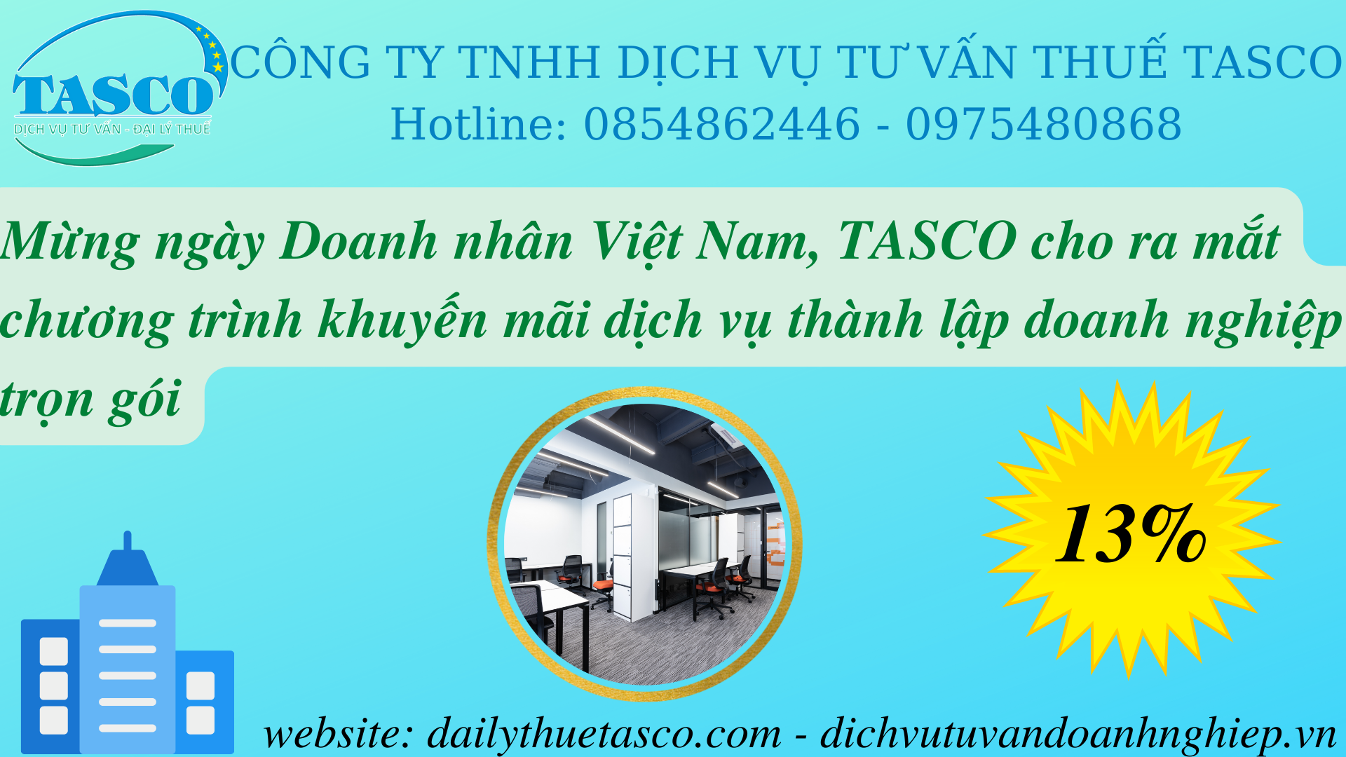 Mừng ngày Doanh nhân Việt Nam, Tasco Giảm 13% phí dịch vụ thành lập doanh nghiệp cho quý khách hàng đăng ký từ ngày 29/09/2022 đến 15/10/2022. Với hơn 17 năm hoạt động trong lĩnh vực này và đã phục vụ trên 10.000+ doanh nghiệp trong nước và doanh nghiệp liên doanh. Tasco luôn đảm bảo về thời gian và chất lượng dịch vụ tốt nhất khi làm việc cùng quý khách hàng, mang lại giá trị lợi ích dành cho doanh nghiệp tạo uy tín làm nên thương hiệu.