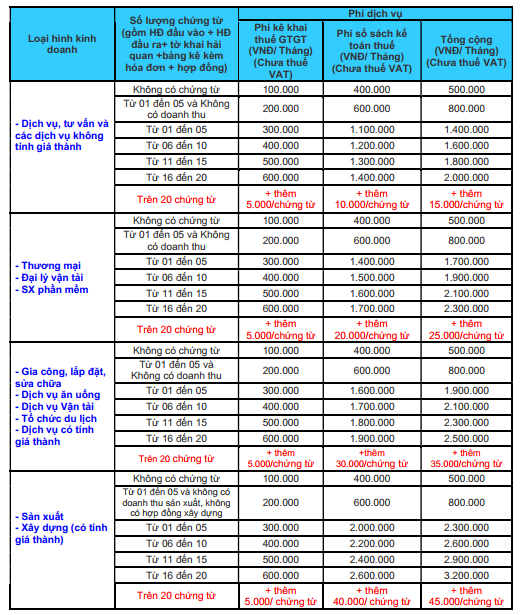 Bảng giá dịch vụ kế toán thuế trọn gói tại TASCO