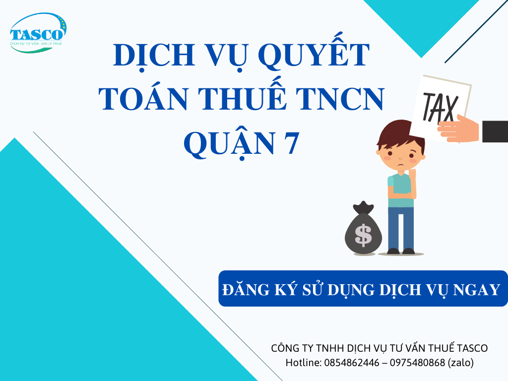 Hằng năm, nhiều người lao động có phát sinh nhiều nguồn thu nhập, không thể ủy quyền công ty quyết toán thuế TNCN thay nên phải tự đi quyết toán với cơ quan thuế. Tuy nhiên, do không quen với thủ tục dẫn đến mất nhiều thời gian chờ đợi, phải đi lại nhiều lần để hoàn thiện hồ sơ với cơ quan thuế. Vì vậy, đại lý thuế TASCO cung cấp "Dịch vụ quyết toán thuế TNCN Quận 7" giúp bạn xử lý, giải quyết mọi vấn đề liên quan đến thuế thu nhập cá nhân một cách chuyên nghiệp và tin cậy nhất.