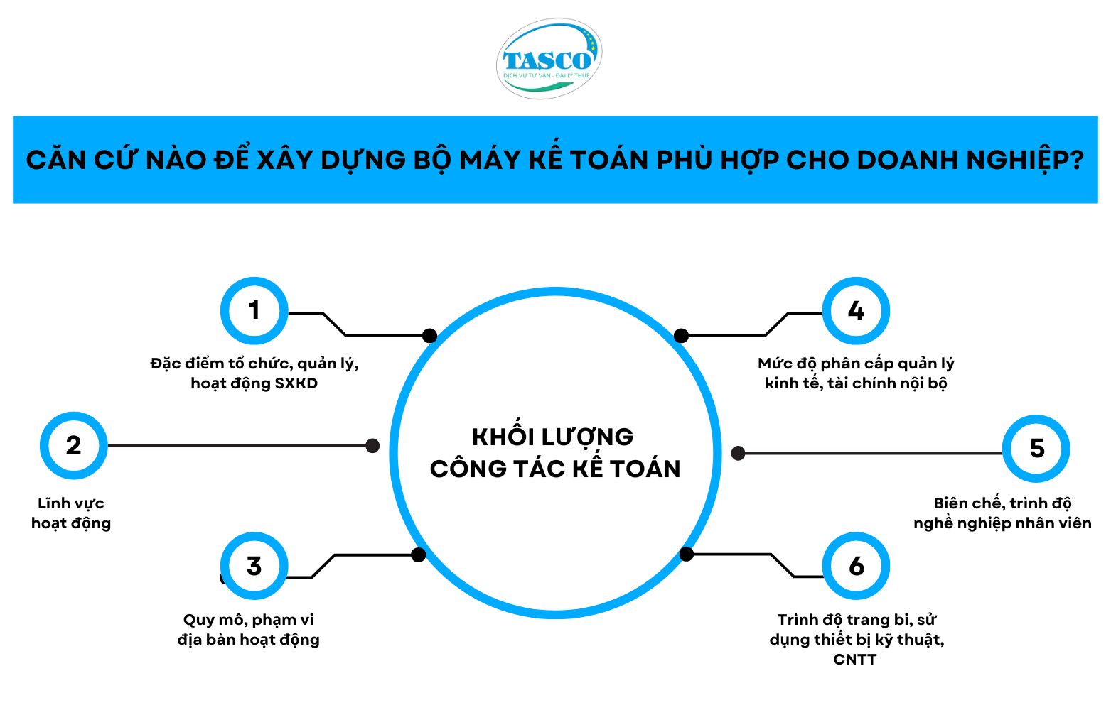 Khối lượng công tác kế toán phụ thuộc vào nhiều yếu tố như: quy mô, phạm vi địa bàn hoạt động, ngành nghề sản xuất kinh doanh, yêu cầu của công tác quản lý và mục đích cung cấp thông tin của đơn vị, đồng thời cũng phụ thuộc vào trình độ nghiệp vụ chuyên môn của đội ngũ cán bộ quản lý, nhân viên kế toán, trình độ trang bị, sử dụng các phương tiện kỹ thuật tính toán, công nghệ thông tin, khả năng phối hợp nhuần nhuyễn giữa các bộ phận…. Đây chính là những căn cứ giúp giám đốc, chủ doanh nghiệp, trưởng bộ phận tài chính kế toán từ đó xem xét xác định cơ cấu tổ chức bộ máy kế toán thích hợp tại đơn vị mình.