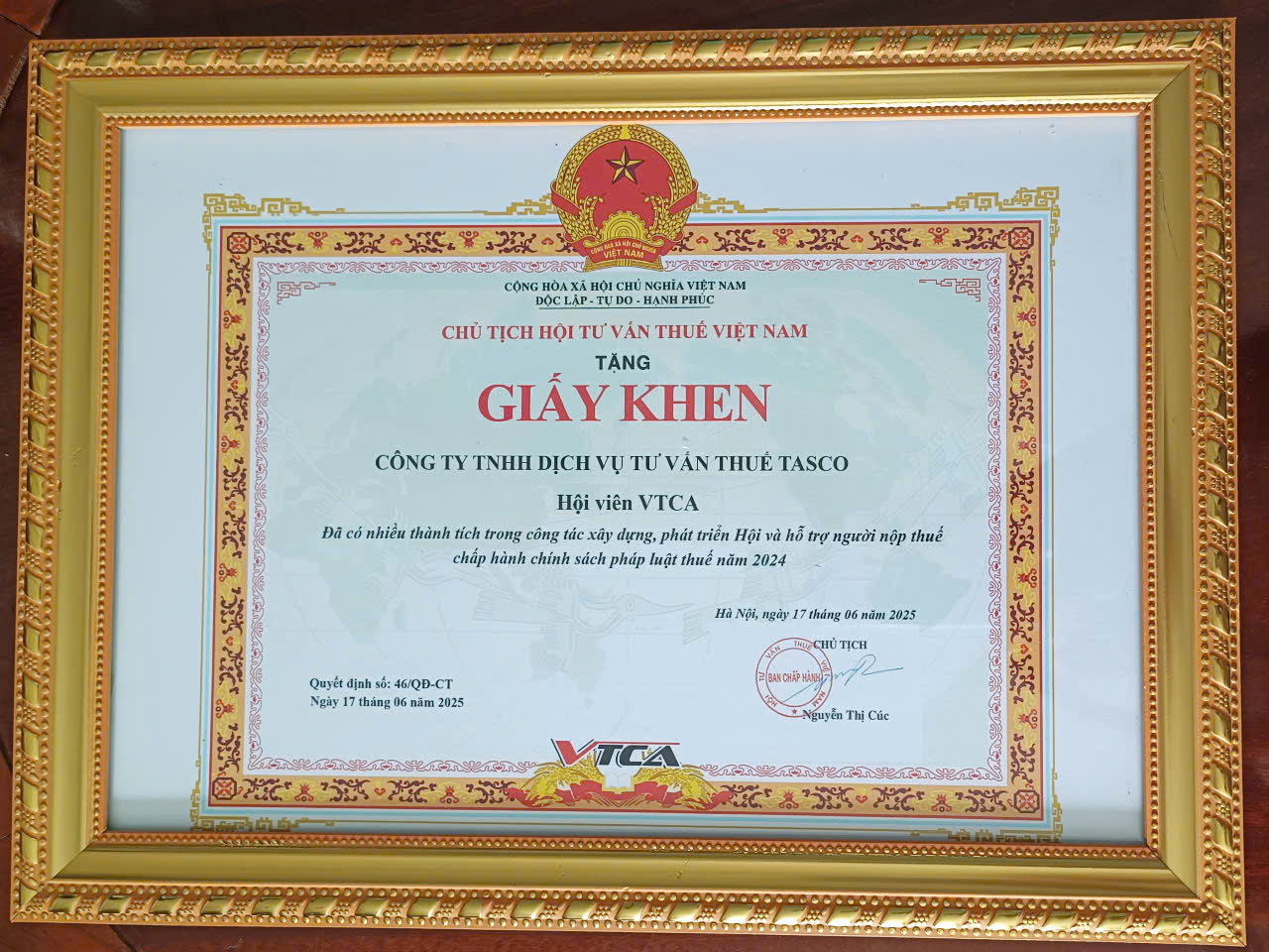 Trong khuôn khổ sự kiện kỷ niệm 17 năm ngày thành lập Hội Tư vấn Thuế Việt Nam (VTCA), công ty TASCO đã vinh dự được VTCA trao tặng Giấy khen, ghi nhận những đóng góp tích cực cho ngành tư vấn thuế, kế toán và tài chính doanh nghiệp trong suốt thời gian qua.