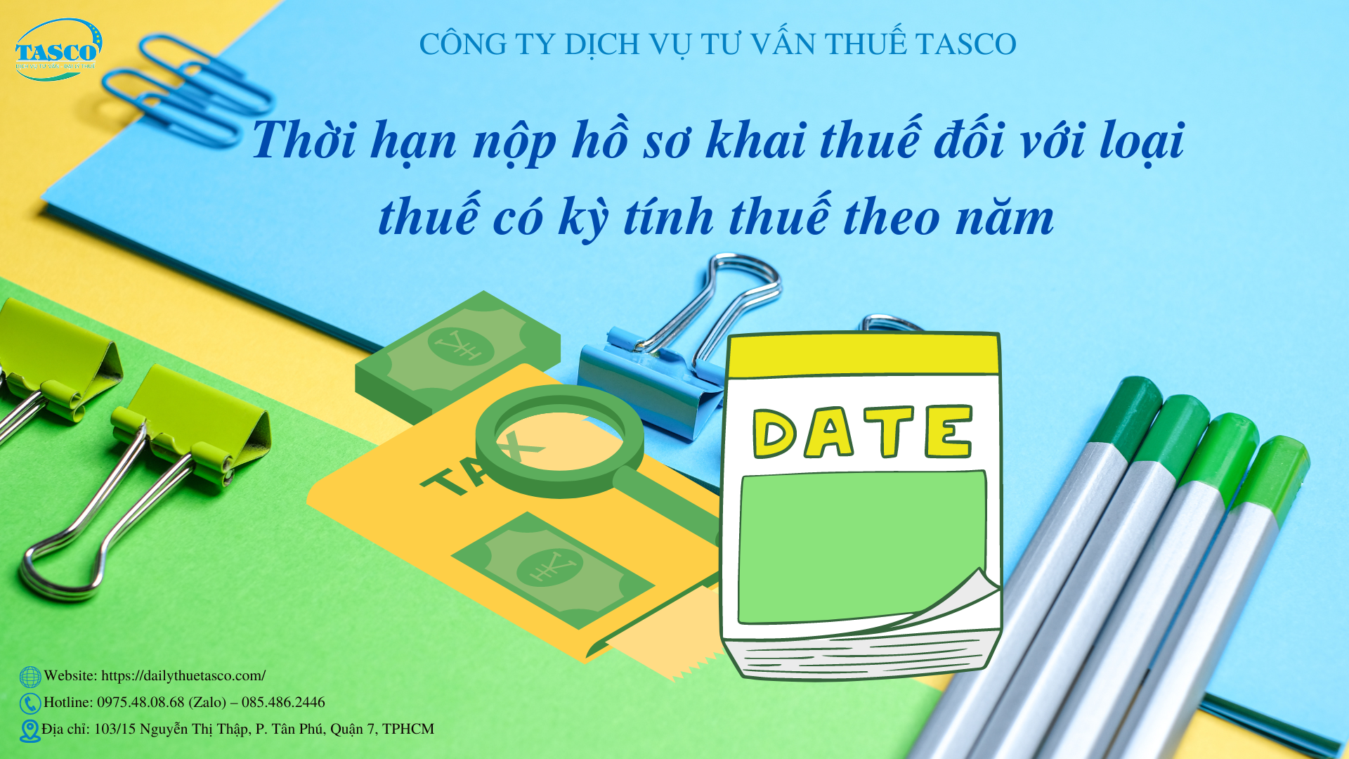Bài viết dưới đây Đại lý thuế Tasco cung cấp đến quý doanh nhân, doanh nghiệp về thời hạn nộp hồ sơ khai thuế đối với loại thuế có kỳ tính thuế theo năm. Nhằm giúp quý doanh nhân, doanh nghiệp thực hiện theo đúng quy trình, quy định của pháp luật hiện hành.