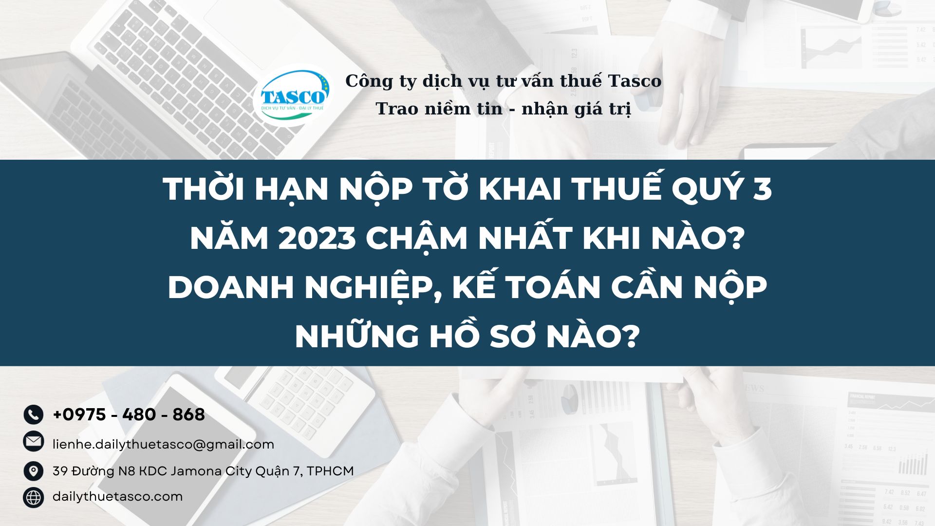 Thời hạn nộp tờ khai thuế quý 3 năm 2023 chậm nhất khi nào? Căn cứ theo khoản 1 Điều 44 Luật Quản lý thuế 2019 quy định về thời hạn nộp hồ sơ khai thuế. Thời hạn nộp tờ khai thuế quý 3 năm 2023 chậm nhất là 31/10/2023 Doanh nghiệp, kế toán cần nộp những hồ sơ nào cùng Tasco tìm hiểu qua bài viết sau đây.