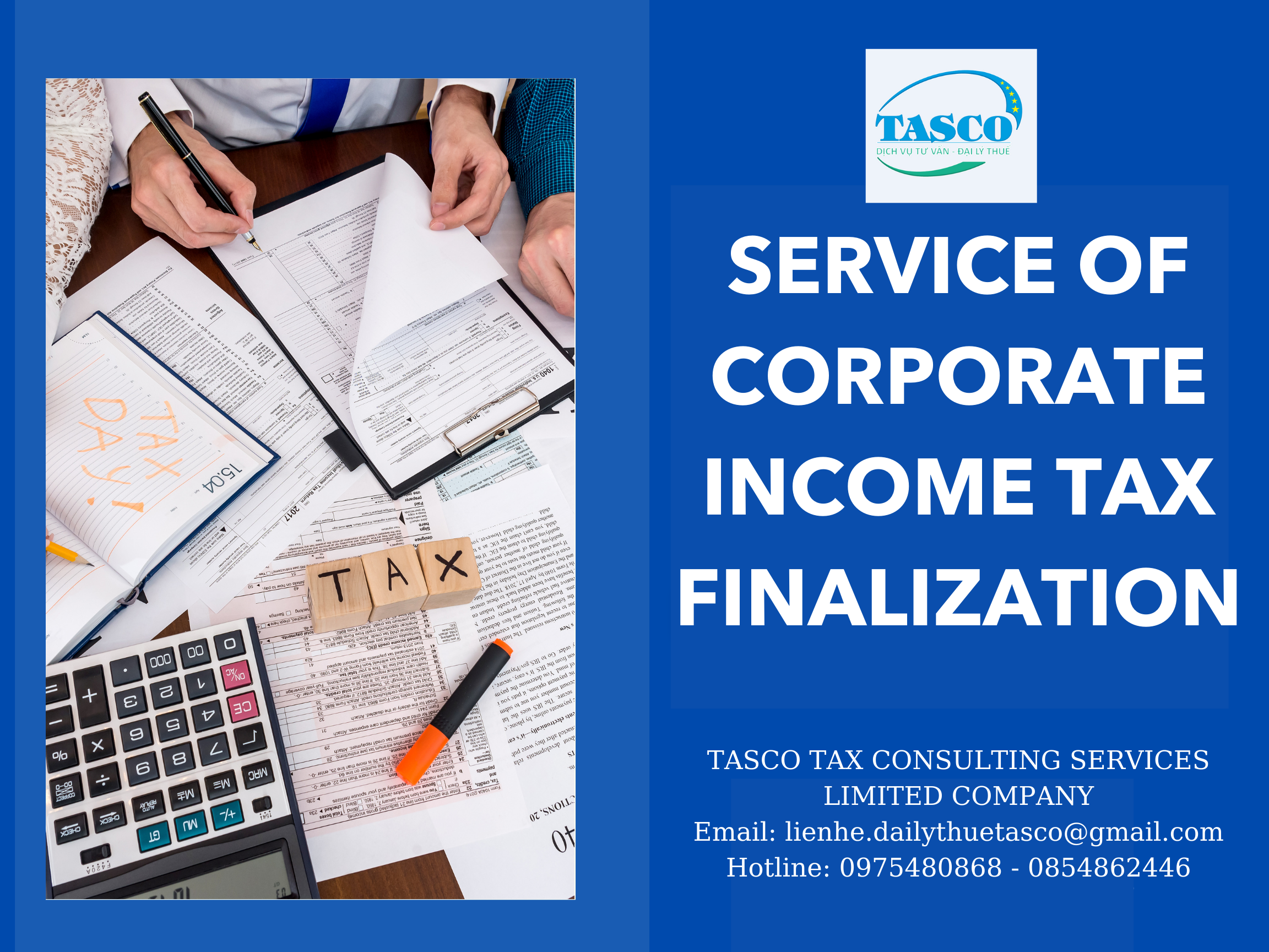 Finalization of corporate income tax is a task that every business must perform at the end of the fiscal year. To ensure complete records when finalizing corporate income tax, avoid errors, and ensure the interests of businesses when finalizing taxes, TASCO tax agents provide CORPORATE INCOME TAX SETTLEMENT service. This is a comprehensive solution for your business, supporting your business during the tax finalization season.