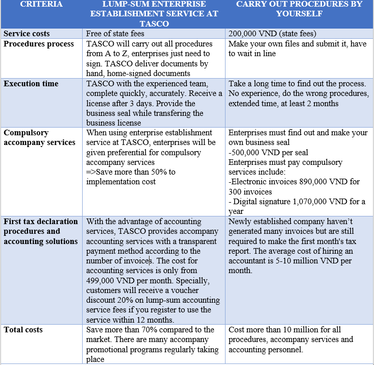 More than anyone else, TASCO understands that entrepreneurs need a quality LUMP-SUM ENTERPRISE ESTABLISHMENT unit to help entrepreneurs get a business license without spending lots of time composing documents, submitting documents or doing any procedures. Come to TASCO, entrepreneurs will be satisfied with the quality of service that TASCO experts bring. With many years of experience in the field of business legal advice, TASCO will take care of all business registration procedures to help entrepreneurs get a business license quickly, economically and effectively.