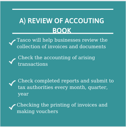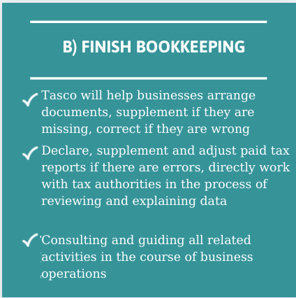 The accounting bookkeeping service is a service for businesses that have had a state of accounting books over many years of operation due to the changing nature of accounting personnel leading to many uncontrollable errors. TASCO's experienced accounting team will help businesses troubleshoot accounting books, adjust and supplement actual documents to match tax declaration books.