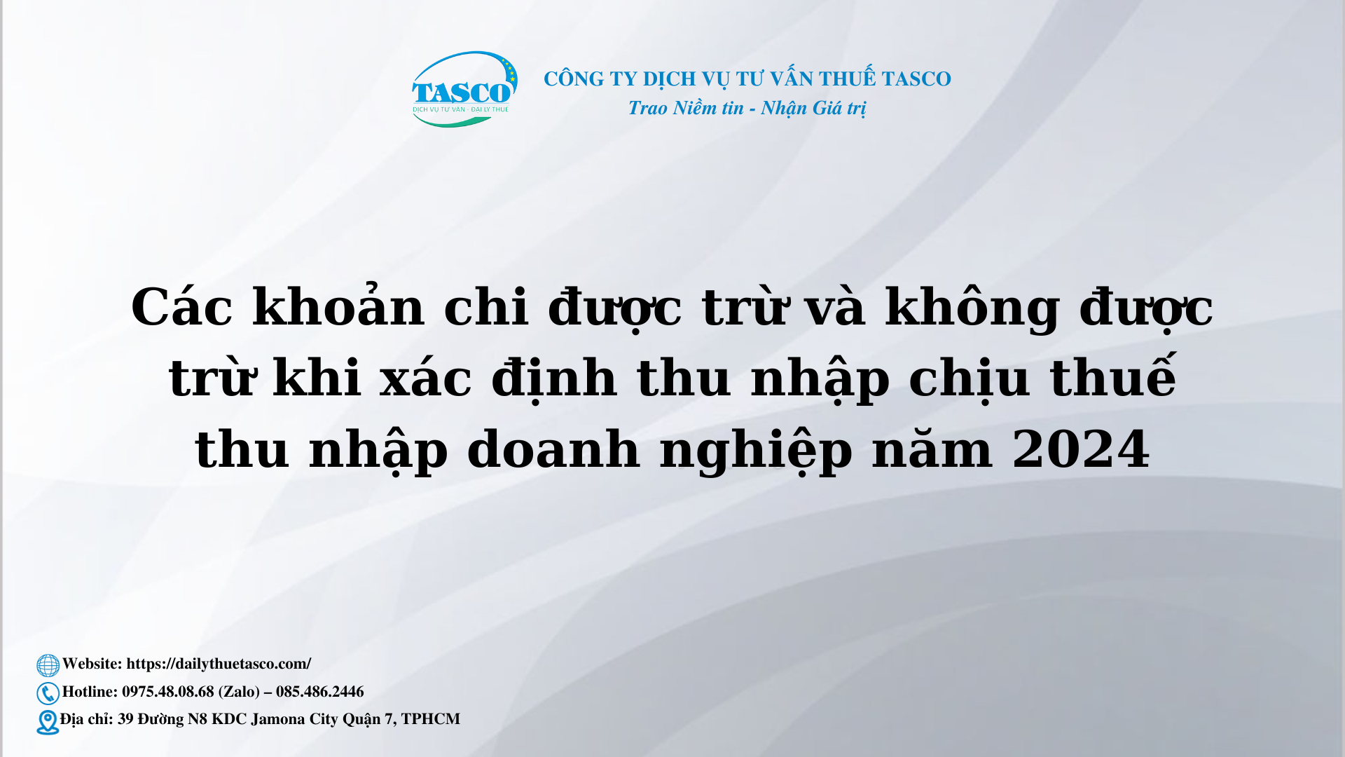 Các khoản chi được trừ và không được trừ khi xác định thu nhập chịu thuế thu nhập doanh nghiệp năm 2024 gồm những khoản chi nào? Đại lý thuế Tasco hướng dẫn doanh nghiệp xác định các khoản chi được trừ và không được trừ khi xác định thu nhập chịu thuế thu nhập doanh nghiệp năm 2024.