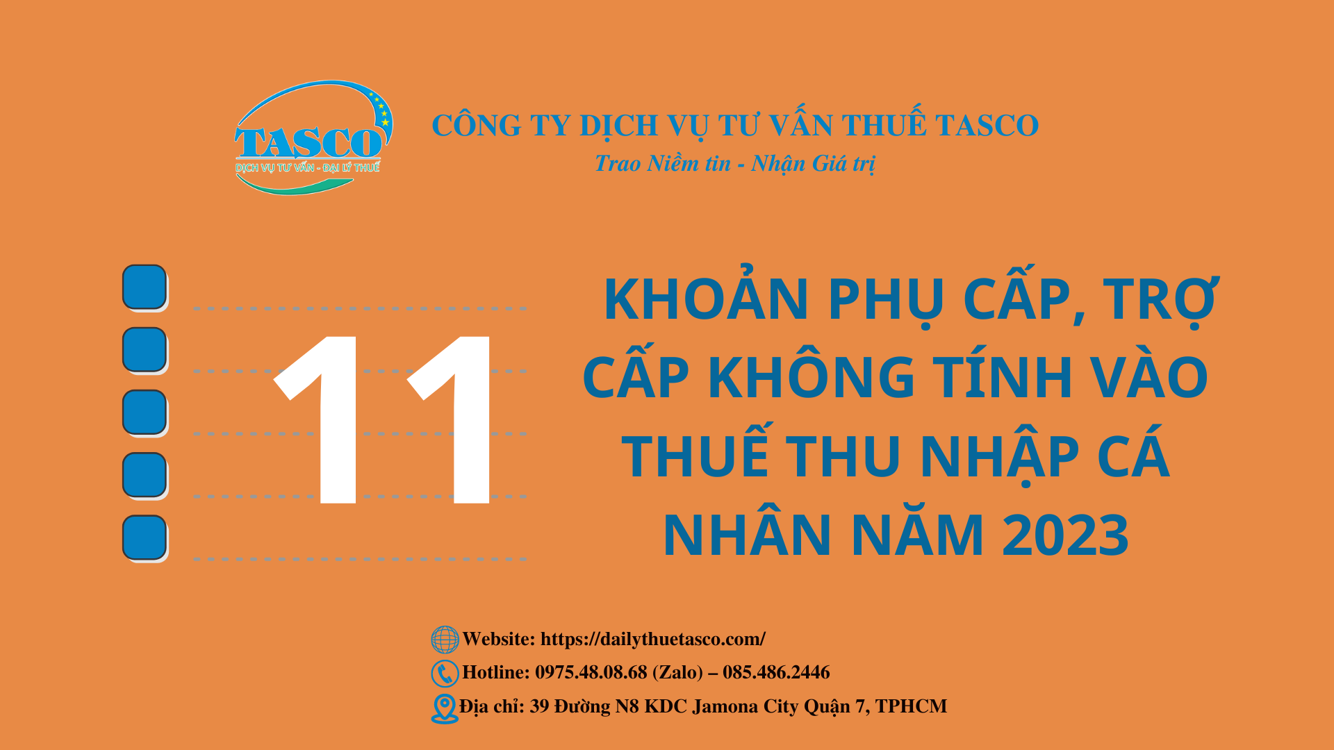 Đại lý thuế Tasco mang đến cho quý doanh nhân thông tin về 11 khoản phụ cấp, trợ cấp không tính vào thuế thu nhập cá nhân năm 2023