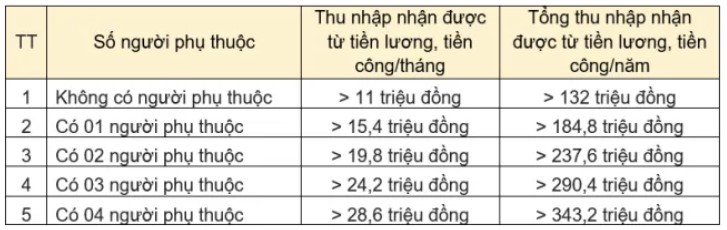 Cá nhân không có người phụ thuộc thì phải nộp thuế thu nhập khi có tổng thu nhập từ tiền lương, tiền công trên 11 triệu đồng/tháng (thu nhập này đã trừ các khoản đóng bảo hiểm bắt buộc theo quy định và các khoản đóng góp khác như từ thiện, nhân đạo,…).