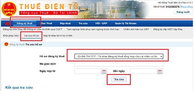 - Sau khi nộp hồ sơ đăng ký MST TNCN để tiến hành tra cứu kết quả hồ sơ ⇨ Bấm chọn “Tra cứu hồ sơ” ⇨ Tại mục “Hồ sơ đăng ký thuế” nhấn chọn ⇨ “05-ĐK-TH-TCT…” ⇨ Bấm “Tra cứu”.