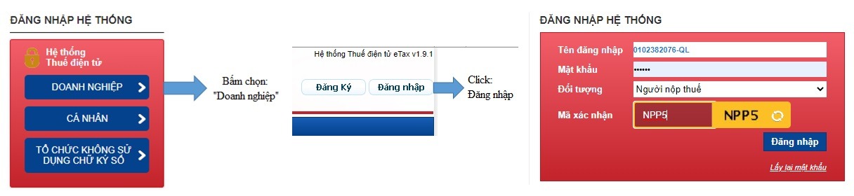 - Sau khi truy cập vào trang thuedientu.gdt.gov.vn à Bấm chọn “Doanh nghiệp” ⇨ “Đăng nhập” ⇨ Nhập thông tin tài khoản đăng nhập và bấm nút “Đăng nhập”. Cụ thể như hình ảnh bên dưới: