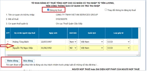 - Nếu muốn làm đăng ký cho 2 người trở lên ⇨ chọn ô “Thêm dòng”.