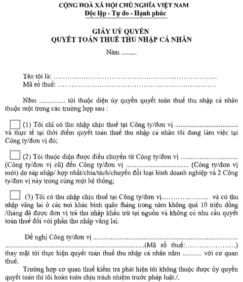 Mẫu giấy ủy quyền quyết toán thuế TNCN mới nhất