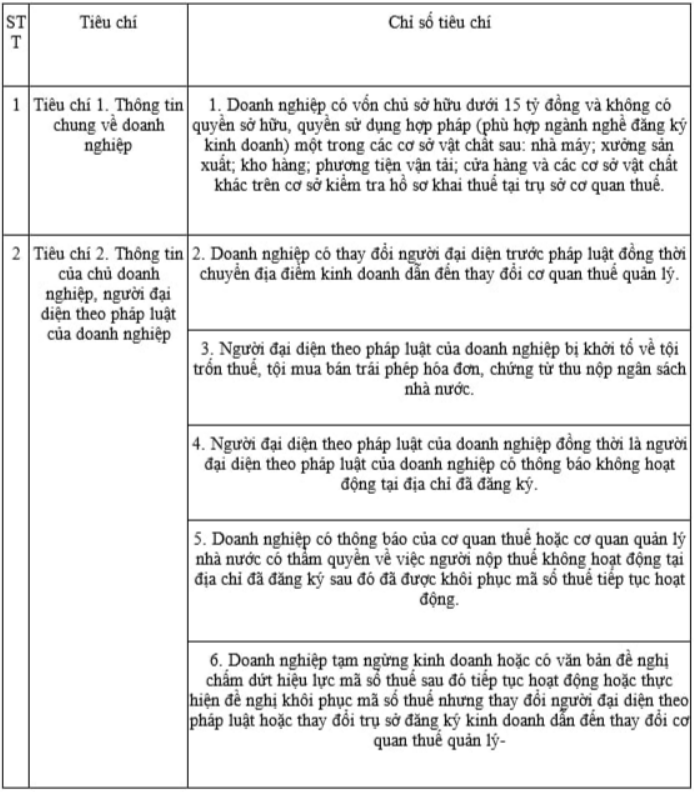 - Doanh nghiệp thuộc loại rủi ro cao về thuế là doanh nghiệp có dấu hiệu rủi ro trong quản lý và sử dụng hóa đơn dựa trên các tiêu chí đánh giá dưới đây: