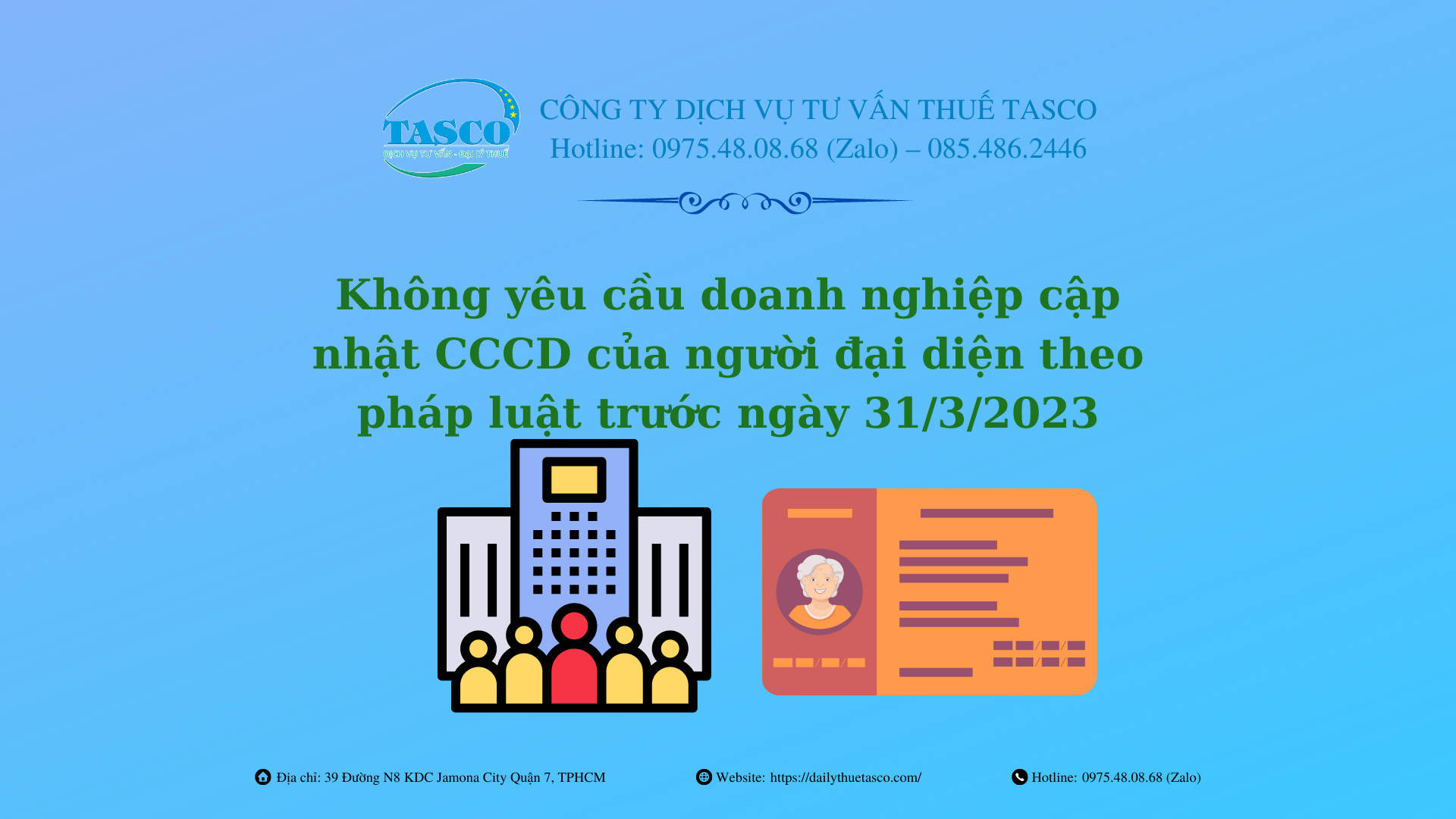Đại lý thuế cập nhật thông tin đến quý doanh nhân về việc không yêu cầu doanh nghiệp cập nhật CCCD của người đại diện theo pháp luật trước ngày 31/3/2023.