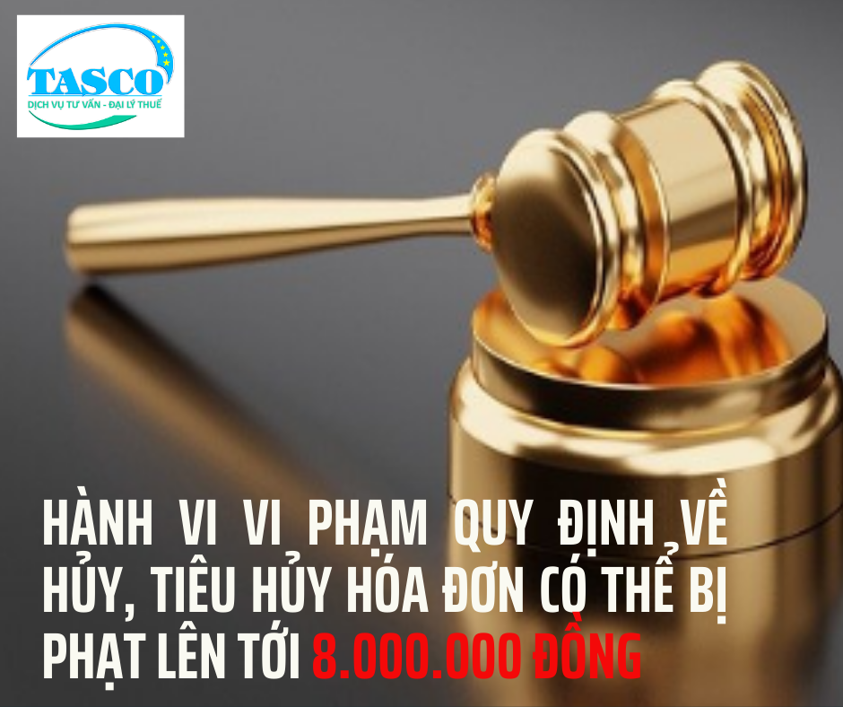 Ngày 19/10/2020 vừa qua, Chính phủ đã ra Nghị định mới về xử phạt vi phạm hành chính về thuế, hóa đơn – Nghị định 125/2020/NĐ-CP. Nghị định này sẽ có hiệu lực từ ngày 05/12/2020. Trong đó, lần đầu tiên đề cập đến chế tài xử phạt đối với hành vi vi phạm “ hủy, tiêu hủy hóa đơn quá thời hạn”, và mức phạt có thể lên tới 8.000.000 đồng. Đại lý thuế TASCO xin thông tin để quý doanh nghiệp rõ hơn về chế tài xử phạt mới này.