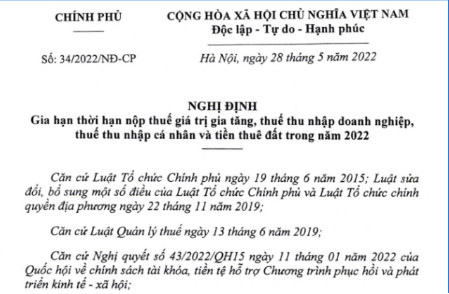 Cập nhật điểm mới Nghị định 34/2022/NĐ-CP do Chính phủ ban hành về gia hạn nộp thuế năm 2022.