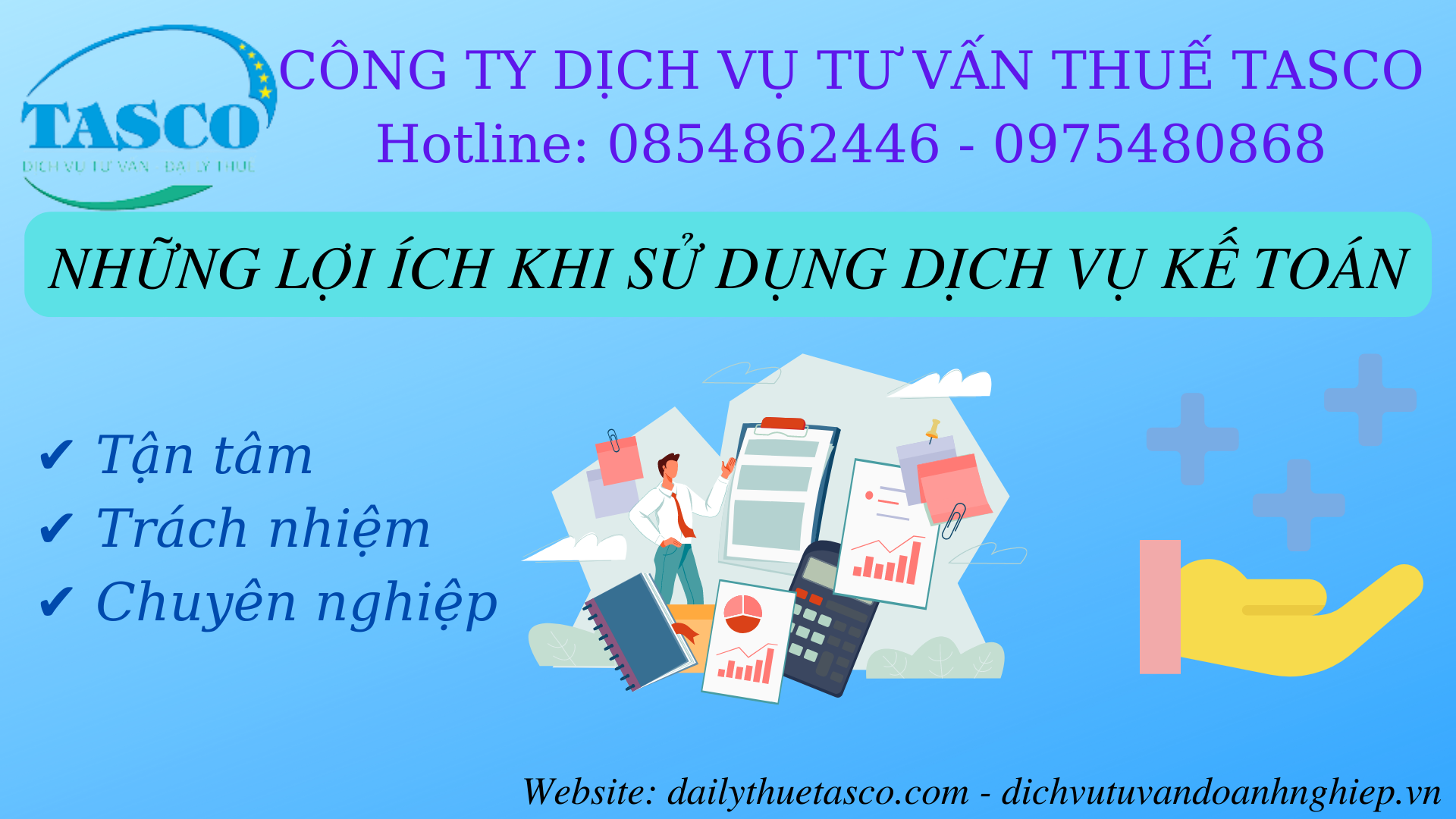 Ngày nay, rất nhiều doanh nghiệp lựa chọn sử dụng dịch vụ kế toán. Để giải quyết các bài toán về kế toán, thuế trong doanh nghiệp của mình. Dịch vụ kế toán trọn gói là dịch vụ vô cùng cần thiết và hữu dụng đối với các doanh nghiệp có quy mô vừa và nhỏ, những doanh nghiệp mới thành lập bị hạn chế về nhân sự và kinh phí. Bài viết này TASCO sẽ giúp quý khách hàng hiểu rõ hơn về các lợi ích khi sử dụng dịch vụ kế toán
