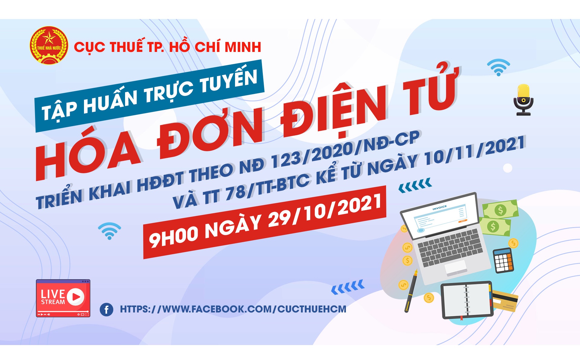 Thực hiện Quyết định số 1832/QĐ-BTC ngày 20/9/2021 của Bộ Tài chính về việc triển khai hóa đơn điện tử tại Thành phố Hồ Chí Minh từ tháng 11 năm 2021, Cục Thuế TP.Hồ Chí Minh ban hành Kế hoạch số 34/KH-CTTPHCM ngày 21/10/2021 về việc tổ chức Hội nghị tập huấn trực tuyến về Hóa đơn điện tử đối với Người nộp thuế.