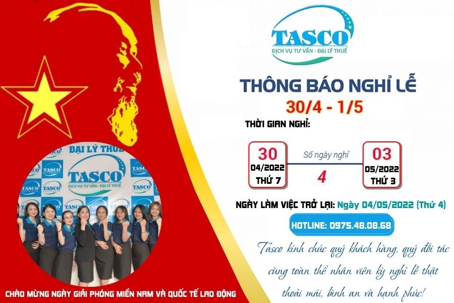Nhân dịp kỷ niệm ngày giải phóng miền Nam, thống nhất đất nước (30/04/1975 – 30/04/2022) và kỷ niệm ngày Quốc tế lao động (01/05/1886 – 01/05/2022), Công ty dịch vụ tư vấn thuế TASCO xin chân thành cảm ơn Quý khách hàng, đã tin tưởng, lựa chọn dịch vụ của chúng tôi trong suốt thời gian qua.