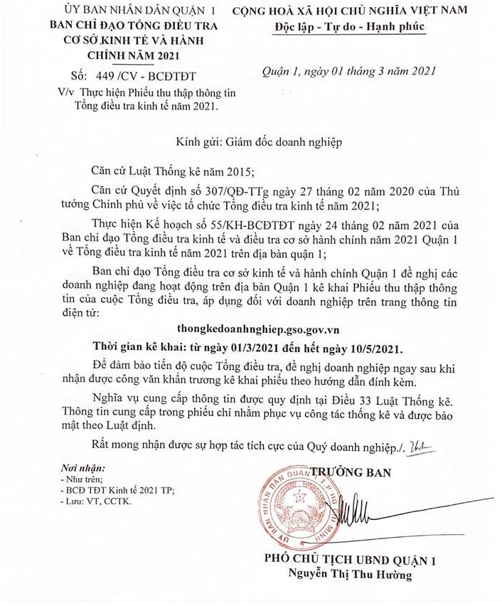 Vừa qua, Ban Chỉ đạo Tổng điều tra cơ sở kinh tế và hành chính năm 2021 của Ủy ban nhân dân quận 1 ban hành công văn số 449/CV-BCĐTĐT về việc thực hiện phiếu thu thập thông tin Tổng điều tra kinh tế năm 2021.