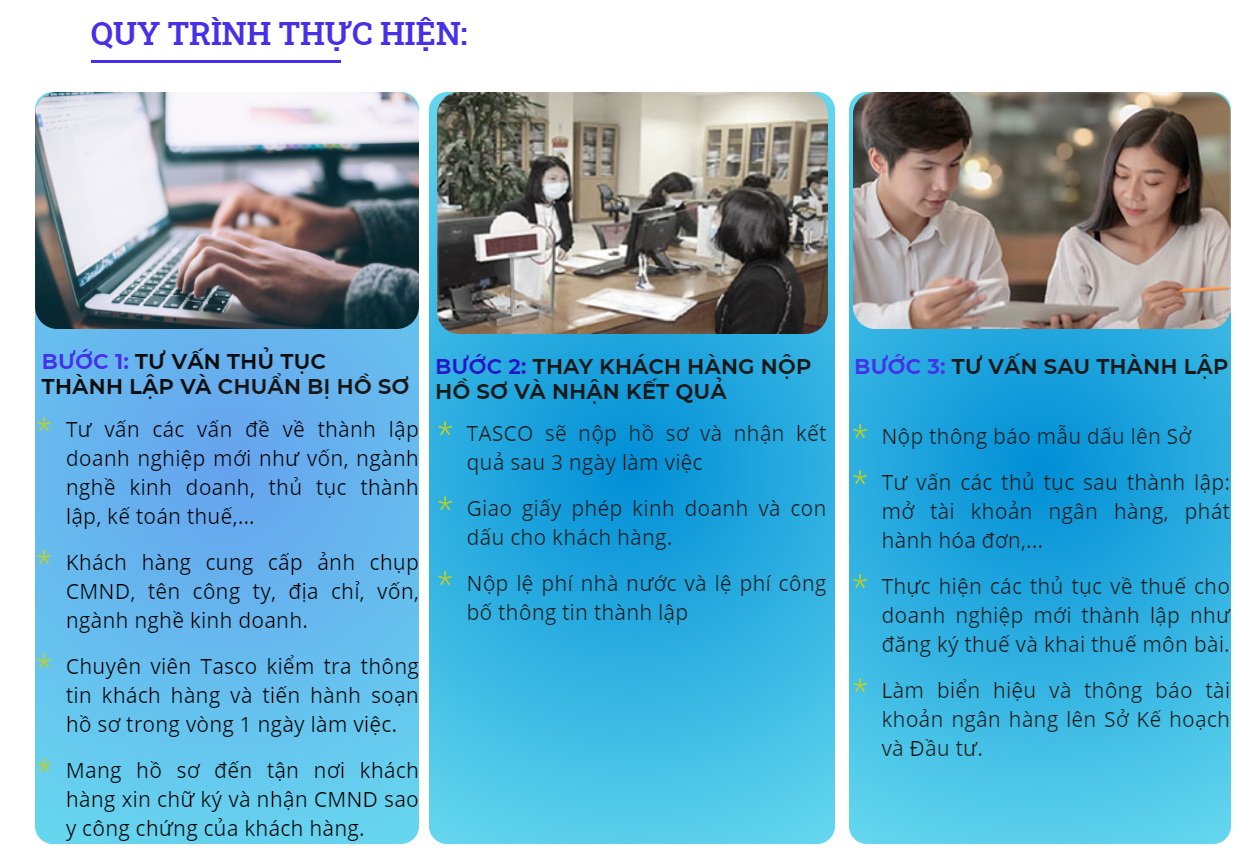 Hơn ai hết, Tasco hiểu quý doanh nhân đang cần một đơn vị THÀNH LẬP DOANH NGHIỆP TRỌN GÓI chất lượng giúp quý doanh nhân có được giấy phép kinh doanh mà không cần phải tốn nhiều thời gian soạn hồ sơ, nộp hồ sơ hay làm bất cứ thủ tục nào.