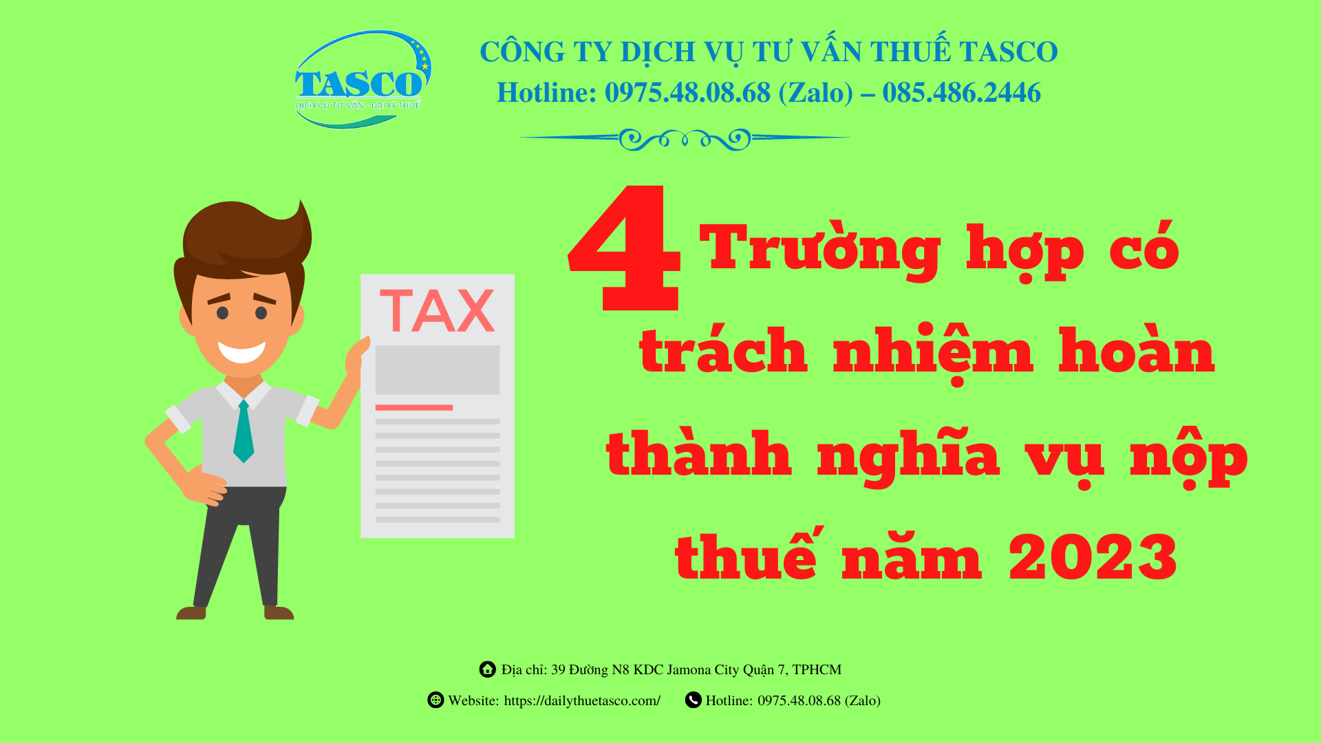 Đại lý thuế Tasco cung cấp đến quý doanh nhân về 04 trường hợp có trách nhiệm hoàn thành nghĩa vụ nộp thuế năm 2023