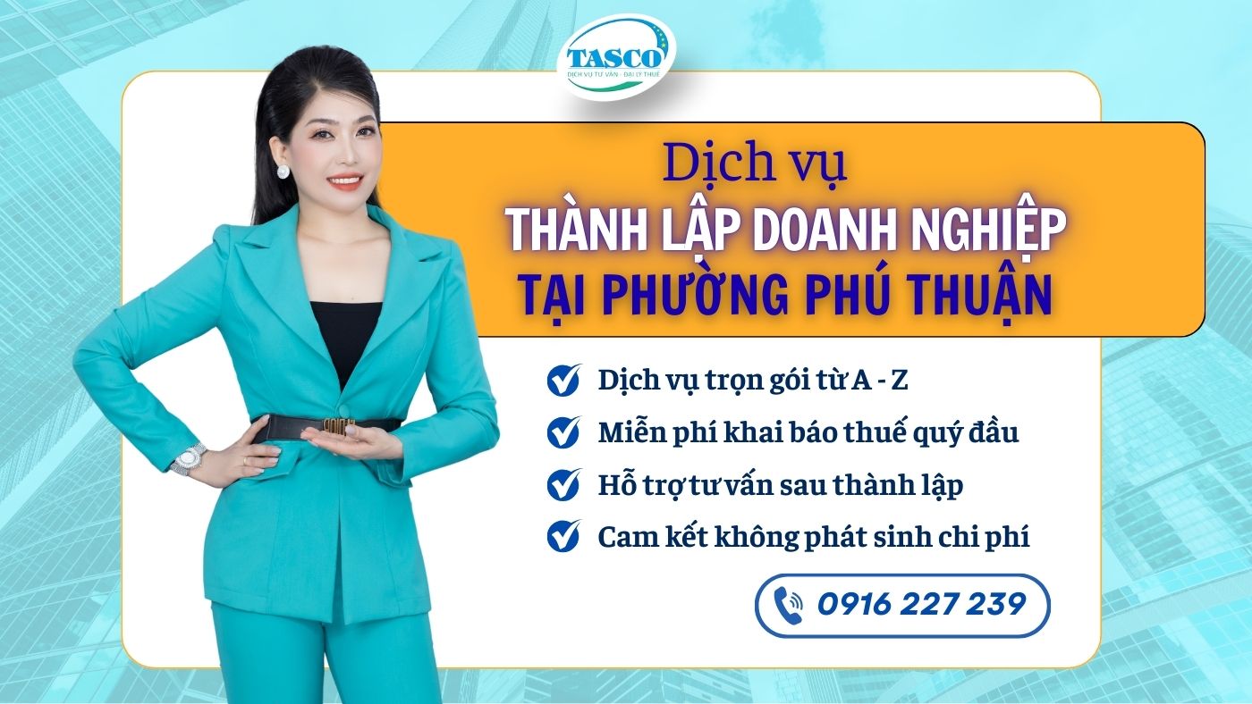 Dịch vụ đăng ký giấy phép kinh doanh tại phường Phú Thuận hỗ trợ trọn gói các thủ tục thành lập doanh nghiệp và đăng ký hộ kinh doanh cá thể. TASCO sẽ tư vấn đầy đủ về hồ sơ pháp lý, đại diện khách hàng thực hiện việc chuẩn bị và nộp hồ sơ, theo dõi quá trình xử lý tại cơ quan chức năng, đồng thời hỗ trợ nhận Giấy phép kinh doanh trong khoảng 3–5 ngày làm việc khi hồ sơ đáp ứng đầy đủ yêu cầu.