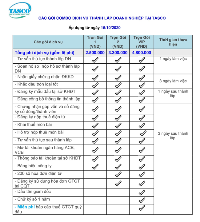 Quý doanh nhân có thể tham khảo thêm về bảng giá của dịch vụ thành lập công ty TNHH: